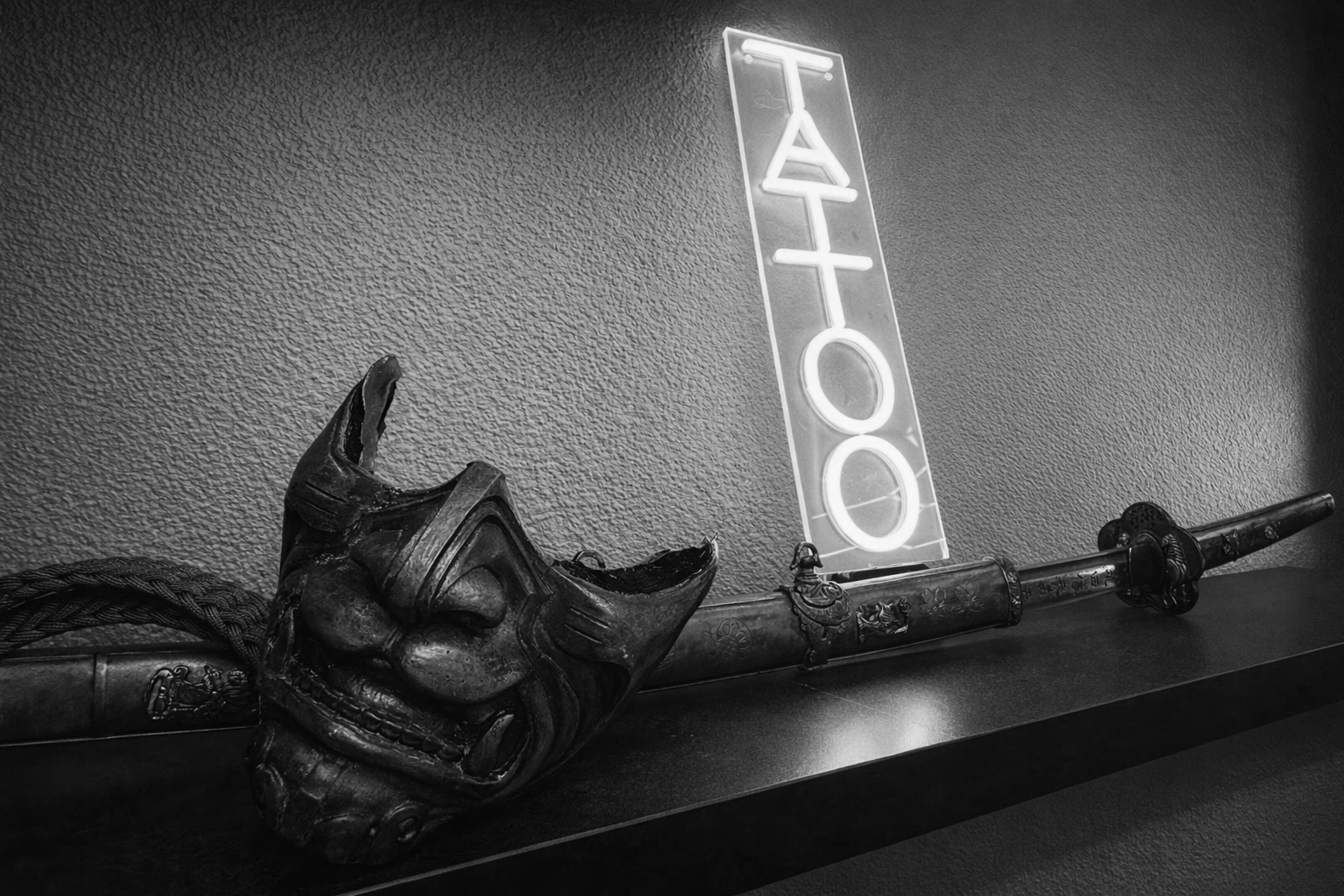 bishop tattoo machine with a Neon sign that reads "tattoo" skull ink cups. cool vibe set up, great atmosphere. professional set up for tattoos.
